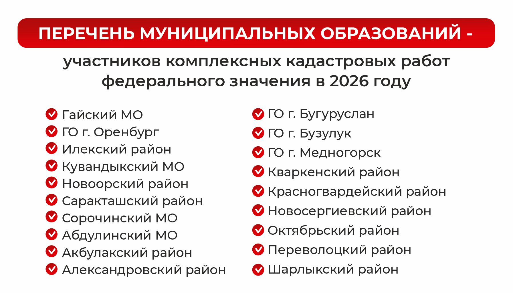 В Оренбургской области в 2026 году запланированы комплексные кадастровые работы федерального значения: работы пройдут в 19 муниципальных образованиях и затронут 438 кадастровых кварталов. Правообладателям, попадающих в территорию проведения ККР, уже начинают направлять уведомления — почтой, на электронную почту или через портал Госуслуг.