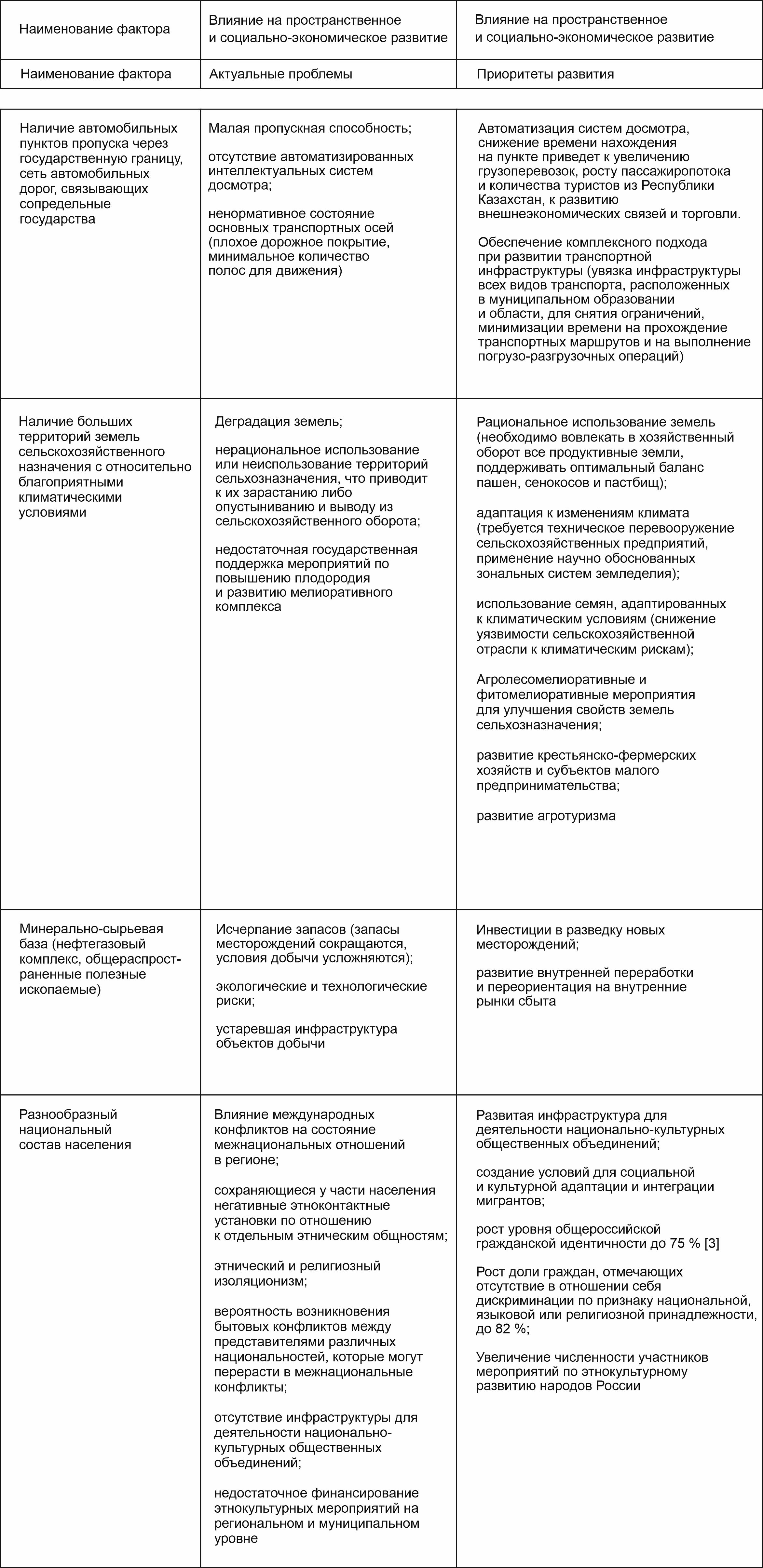 В таблице 1 представлены уникальные факторы, присущие исключительно приграничным территориям Оренбургской области и оказывающие непосредственное влияние на пространственное и социально-экономическое развитие территорий. Определены актуальные проблемы и приоритеты развития