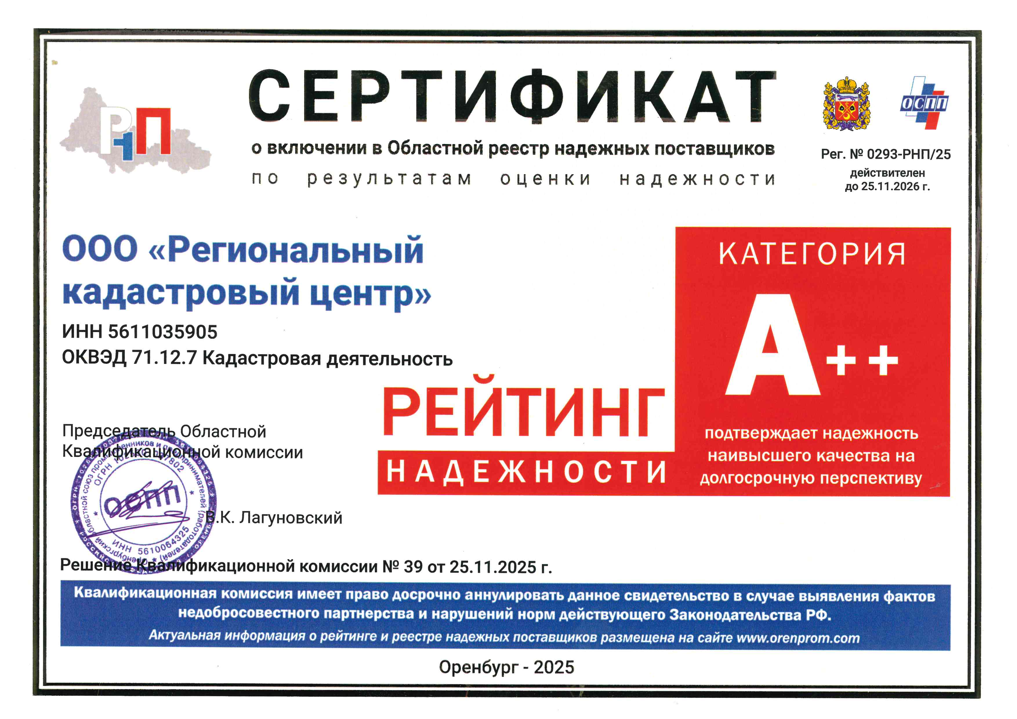 Компания «Региональный кадастровый центр» включена в региональный реестр надежных поставщиков с присвоением высокой категории надежности "А ++" – надежность наивысшего качества на долгосрочную перспективу.